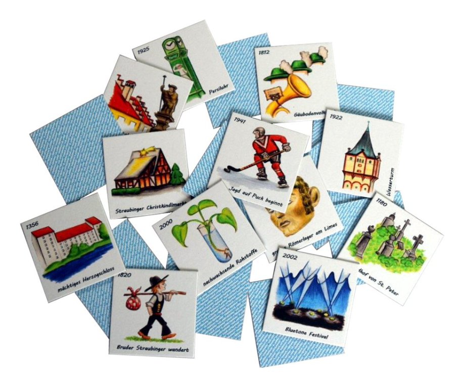 Unser Memospiel "Straubing für Besserwisser" nimmt die Spieler mit auf eine Reise durch die Geschichte der Stadt Straubing. In der beiliegenden Spielanleitung finden Sie alles Wissenswerte zu den Kartenmotiven. Das Spiel umfasst 36 Bildpaare und ist für 2-10 Spieler ab 5 Jahren geeignet.